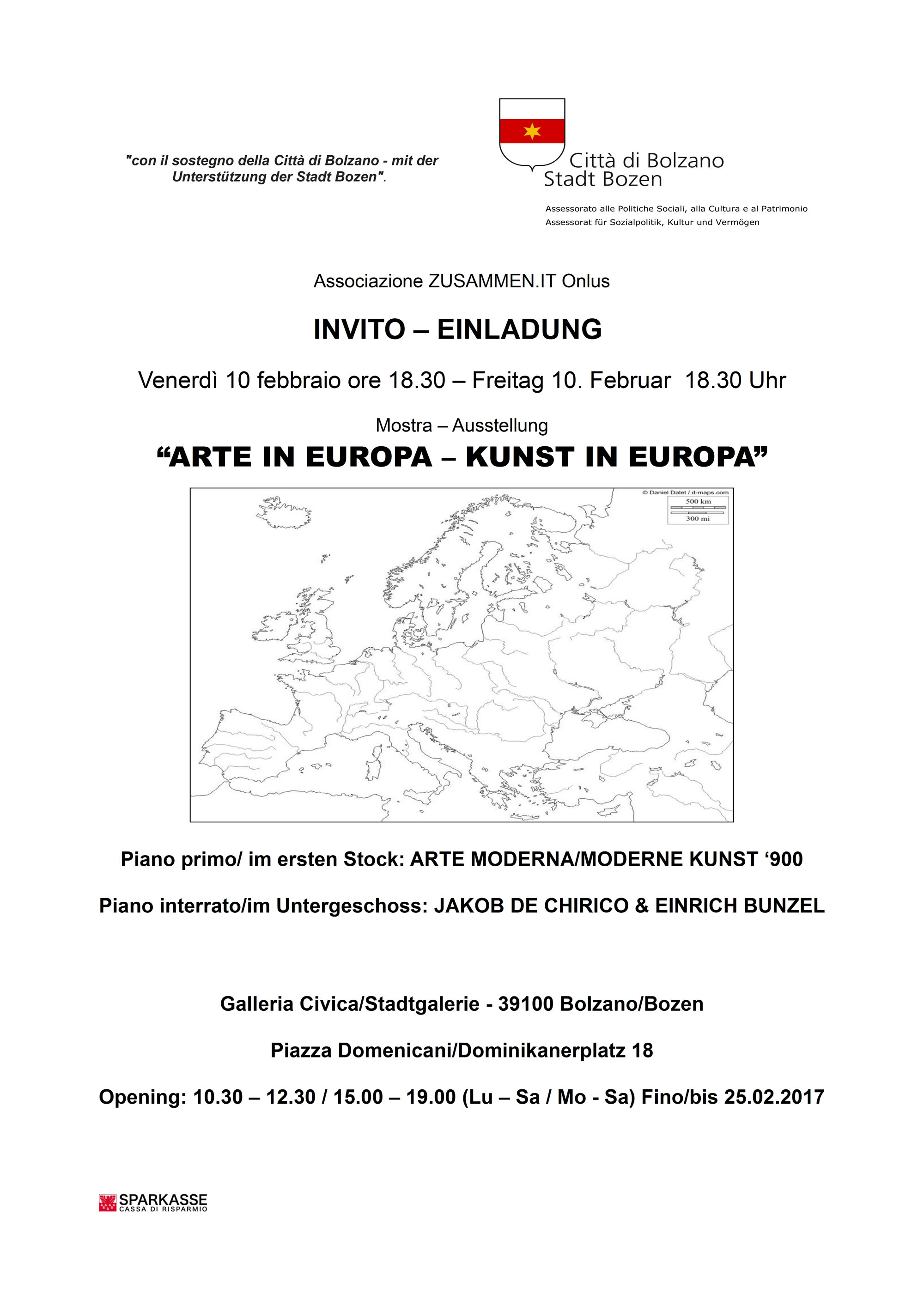 La Galleria Civica di Bolzano propone una doppia offerta espositiva a partire dalle ore 18.30 di venerdì 10 fino al 25 febbraio, con opere moderne del ‘900 europeo e performance di artisti contemporanei che completeranno il programma della mostra "Arte in Europa – Kunst in Europa", promossa dall'associazione Zusammen.it Onlus e dal Comune di Bolzano.