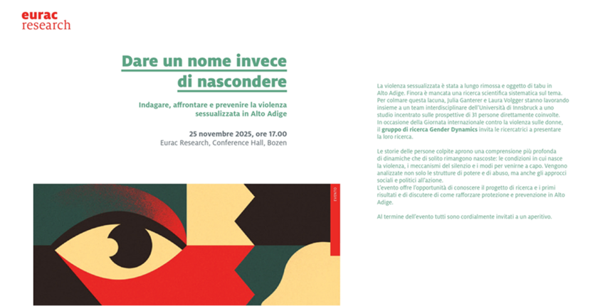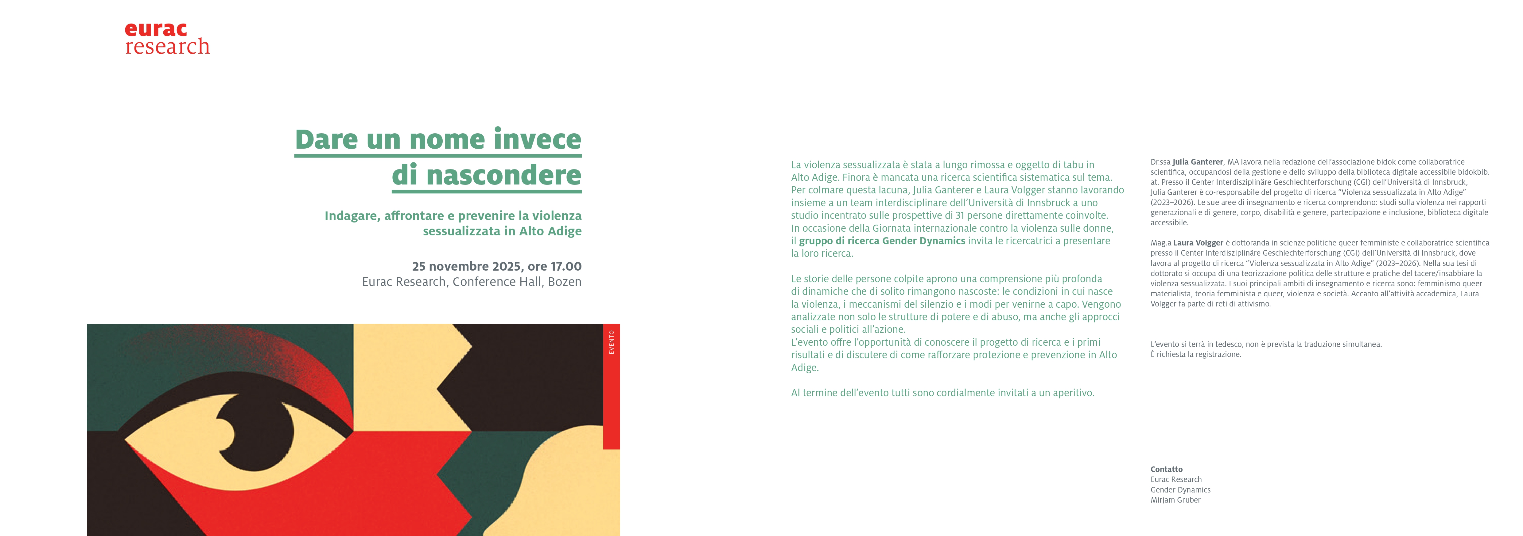La violenza sessualizzata è stata a lungo rimossa e oggetto di tabù in Alto Adige. Finora è mancata una ricerca scientifica sistematica sul tema. Per colmare questa lacuna, Julia Ganterer e Laura Volgger stanno lavorando insieme a un team interdisciplinare dell'Università di Innsbruck ad uno studio incentratato sulle prospettive di 31 persone direttamente coinvolte. In occasione della Gioranta internazionale contro la violenza sulle sonne, il gruppo di ricerca Gender Dynamics invita le ricercatrice a presentare la loro ricerca.
