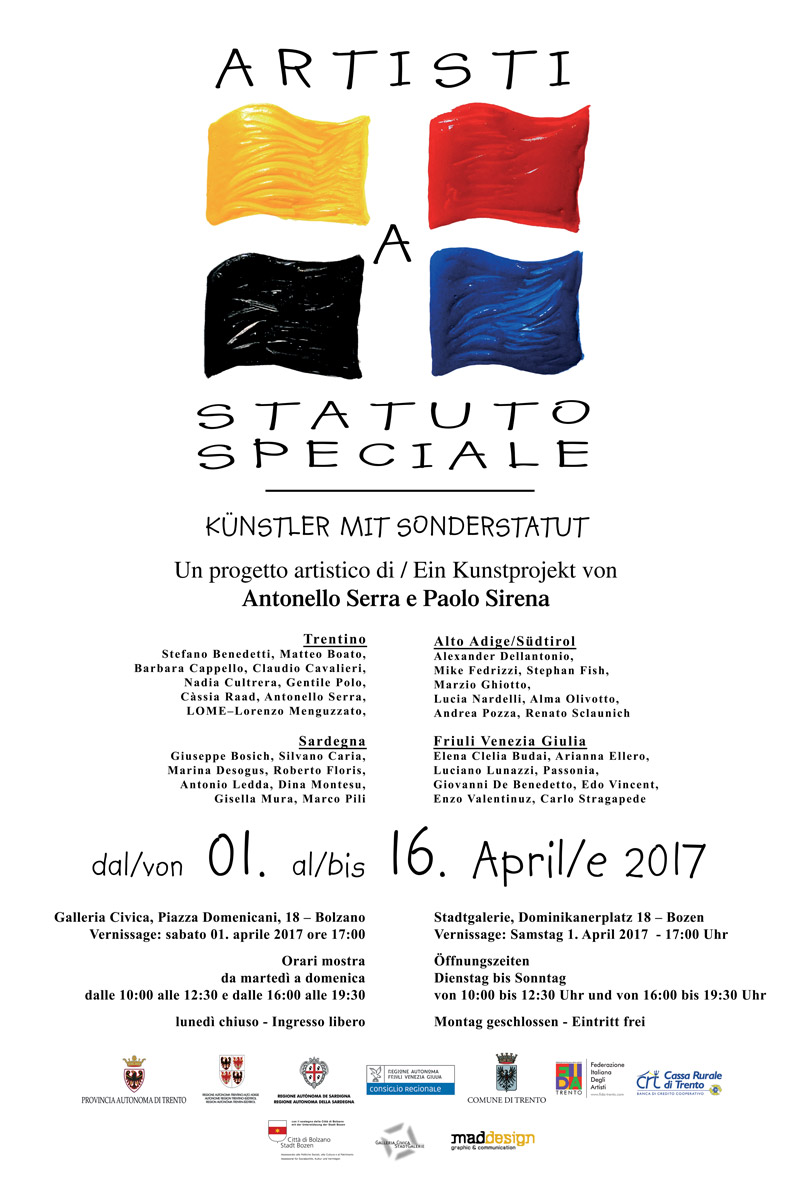 L’evento "Artisti a statuto speciale", partito da Trento presso le sale di Torre Mirana, prosegue ora a Bolzano in Galleria Civica, piazza Domenicani, dall’1 al 16 aprile 2017 (inaugurazione sabato 1 aprile 2017 ore 17.00).