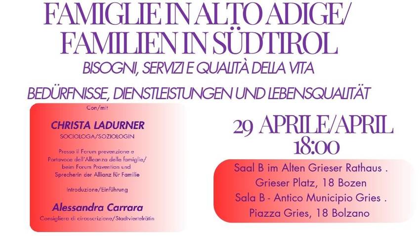 Le famiglie, anche in Alto Adige, vivono trasformazioni continue: nuclei più piccoli, una rete parentale più ristretta e meno disponibile, invecchiamento della popolazione e costi della vita elevati. Tutto ciò genera aspettative e bisogni nuovi, che richiedono politiche familiari e sociali che sappiano fornire risposte sostenibili e coordinate. Come vanno organizzati e articolati i servizi educativi e sociali sul territorio? Come possono intervenire in maniera efficace gli enti locali? Di cosa hanno veramente bisogno le famiglie in Alto Adige?